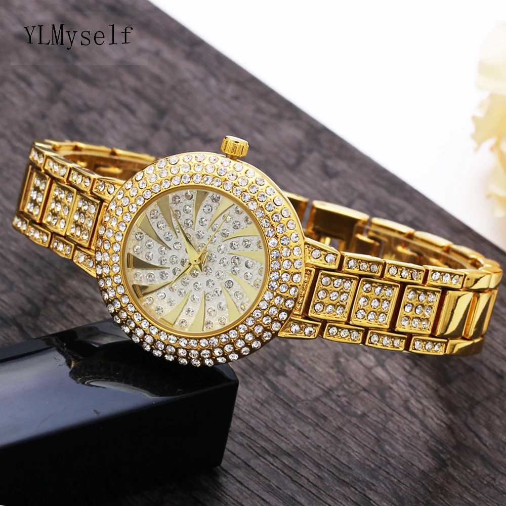 Gold Fashion & Casual watch round case metal bracelet high quality luxury quartz white crystal watc